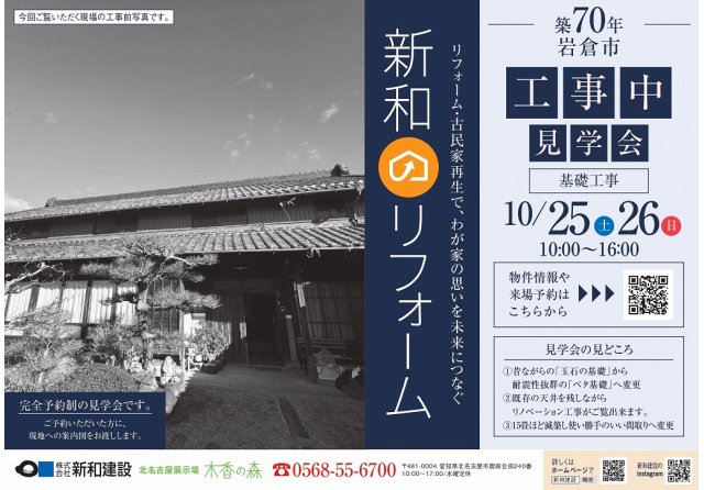 築70年リフォーム基礎工事中見学会in愛知県岩倉市築70年リフォーム工事中の現場で、住宅の土台である基礎を改修する様子をご覧いただける見学会です。古い基礎を最新の技術で耐震補強を行い、ひび割れの補修を行います。ぜひ現地でじっくりご覧ください。お家の見どころポイント◆ 昔ながらの「玉石の基礎」から耐震性抜群の「ベタ基礎」へ変更◆ 既存の天井を活かしたリノベーション工事を...[ 続きを読む ]