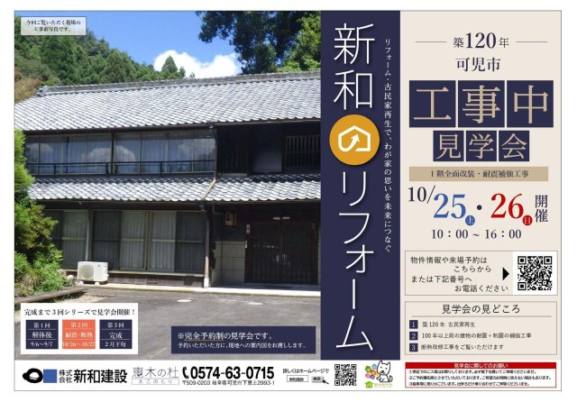 築120年リフォーム耐震・断熱工事中見学会in岐阜県可児市築120年リフォーム工事中の現場で、断熱対策と耐震工事の様子をご覧いただける見学会です。夏の暑さ・冬の寒さが室内に入ってくるのを出来るだけ防ぎ、古いお住まいでは心許なかった耐震性能を国の基準に合わせて向上させます。ぜひ現地でじっくりご覧ください。お家の見どころポイント◆ 築120年の古民家再生◆ 100年以上前...[ 続きを読む ]