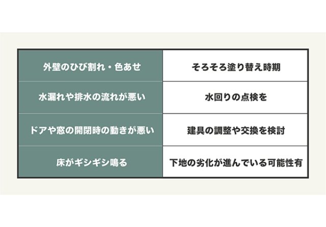 ある程度の築年数が経過したお客様から多いのが、「我が家のメンテナンスのタイミングっていつですか?」というご質問。どんなタイミングで行えばいいのでしょうか?こちらが目安となる家の症状の一例です。