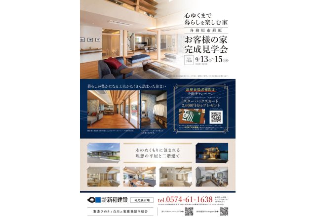 新和建設 可児展示場(0574-61-1638)またはイベント予約フォームへ