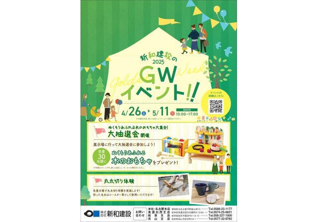 各展示場では、ゴールデンウィークもたのしい企画盛りだくさんでお待ちしております。ご家族みなさま揃って、ぜひお近くの展示場へお出かけください。◆大抽選会展示場に行って豪華景品をゲットしよう!詳細はページ下チラシをご覧ください。◆SINWA VillageクイズSINWA Villageにちなんだクイズに参加しよう!◆丸太切り体験(新築展示場限定開催)各展示場で丸太切り体...[ 続きを読む ]