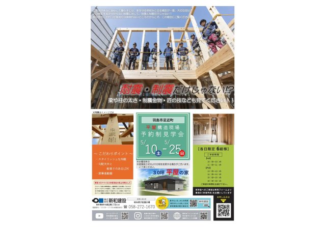 ~30坪平屋の住まい~新築構造見学会in岐阜県羽島市30坪の平屋の住まいを建築中の現場で、建物の構造をご覧いただける見学会です。孫子の代まで安心して受け継ぐことのできる住まいの秘密とは?梁や柱の太さ、耐震・制震性能、匠の技など、ぜひじっくりご覧ください。お家の見どころポイント◆ スタイリッシュな外観の平屋◆ 勾配天井と板張りのあるLDK◆ こだわりの詰まった家事ラク動...[ 続きを読む ]