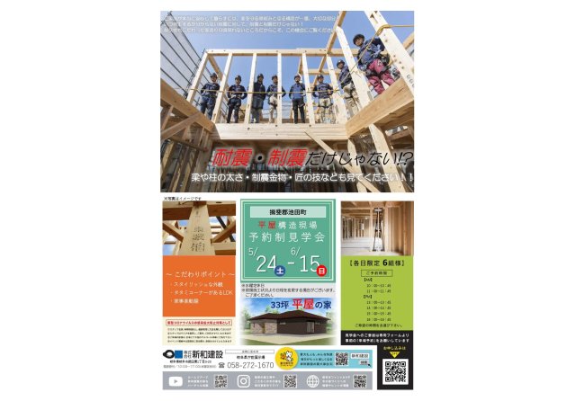 ~33坪平屋の住まい~新築構造見学会in岐阜県池田町33坪の平屋の住まいを建築中の現場で、建物の構造をご覧いただける見学会です。孫子の代まで安心して受け継ぐことのできる住まいの秘密とは?梁や柱の太さ、耐震・制震性能、匠の技など、ぜひじっくりご覧ください。お家の見どころポイント◆ スタイリッシュな外観◆ 畳コーナーがあるLDK◆ 家事ラク動線▼詳しくはこちらからhttp...[ 続きを読む ]