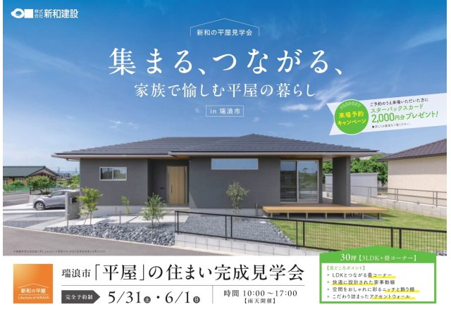 ~家族で愉しむ30坪平屋の暮らし~新築完成見学会in岐阜県瑞浪市30坪の平屋のお住まい。LDKとつながる畳コーナーや快適に設計された家事動線、空間をおしゃれに彩るニッチと飾り棚など、こだわりのお住まいをご覧いただけます。ぜひ現地でご覧ください。お家の見どころポイント◆ LDKとつながる畳コーナー◆ 快適に設計された家事動線◆ 空間をおしゃれに彩るニッチと飾り棚▼詳しく...[ 続きを読む ]